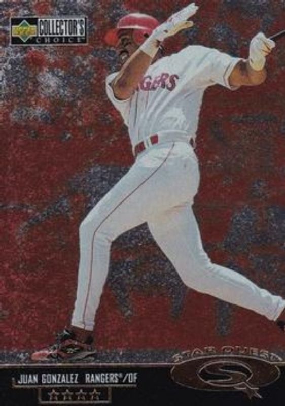 The Juan Gonzalez 1998 Upper Deck Collector's Choice #SQ83 StarQuest card is 1 of 16 Juan Gonzalez's card variations in the 1998 Upper Deck Collector's Choice set being tracked by Sports Card Investor, including Evolution Revolution, Golden Jubilee 5x7, Mini Bobbing Heads, Series One Blaster Jumbo 5x7, and StarQuest.
