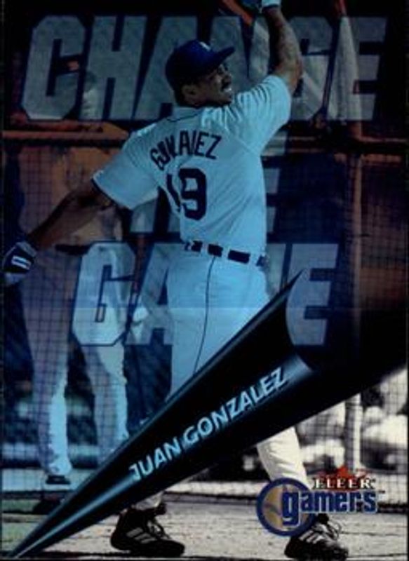 The Juan Gonzalez 2000 Fleer Gamers #13CG Change the Game card is 1 of 4 Juan Gonzalez's card variations in the 2000 Fleer Gamers set being tracked by Sports Card Investor, including Base, Extra, and Determined.