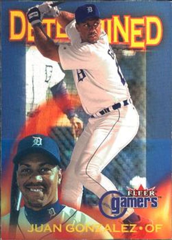 The Juan Gonzalez 2000 Fleer Gamers #14D Determined card is 1 of 4 Juan Gonzalez's card variations in the 2000 Fleer Gamers set being tracked by Sports Card Investor, including Base, Extra, and Change the Game.