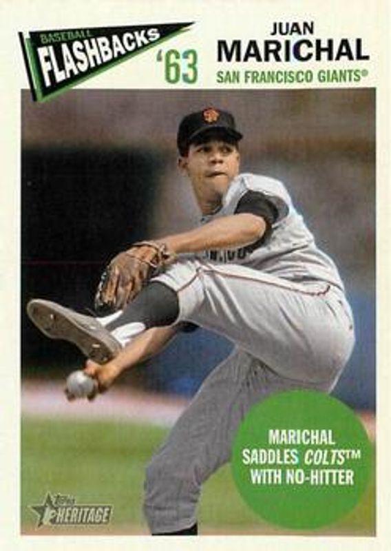 The Juan Marichal 2012 Topps Heritage #BF-JM Baseball Flashbacks card is 1 of 5 Juan Marichal's card variations in the 2012 Topps Heritage set being tracked by Sports Card Investor, including 50th Anniversary Buybacks, 63 Mint, Real One Autographs, and Real One Autographs - Red Ink /63.