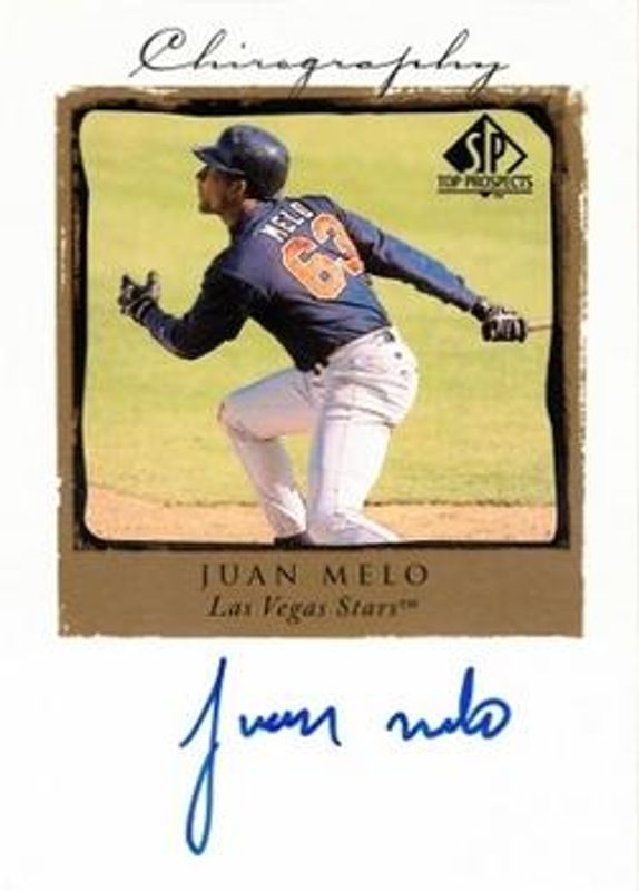 The Juan Melo 1999 SP Top Prospects #JM Chirography card is 1 of 4 Juan Melo's card variations in the 1999 SP Top Prospects set being tracked by Sports Card Investor, including Base, President's Edition /10, and Destination: The Show /100.