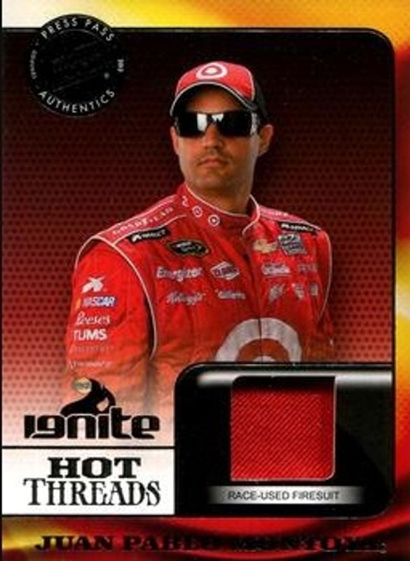 The Juan Pablo Montoya 2013 Press Pass Ignite #HT-JPM Hot Threads - Silver card is 1 of 19 Juan Pablo Montoya's card variations in the 2013 Press Pass Ignite set being tracked by Sports Card Investor, including #27 Base, #63 Base, #27 Color Proof Cyan, #63 Color Proof Cyan, and #63 Color Proof Magenta.