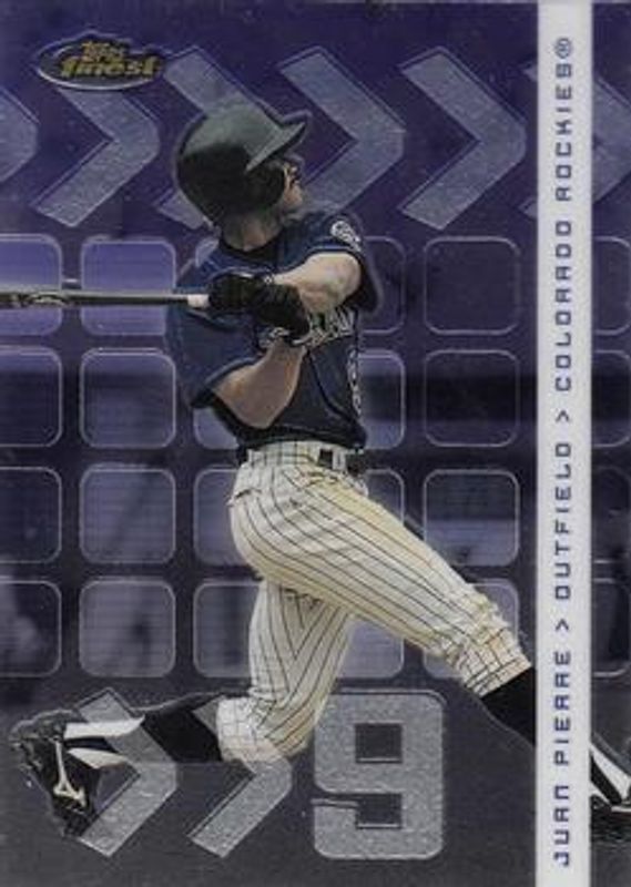 The Juan Pierre 2002 Topps Finest #65 Base card is 1 of 3 Juan Pierre's card variations in the 2002 Topps Finest set being tracked by Sports Card Investor, including Refractor /499, and X-Fractor /299.