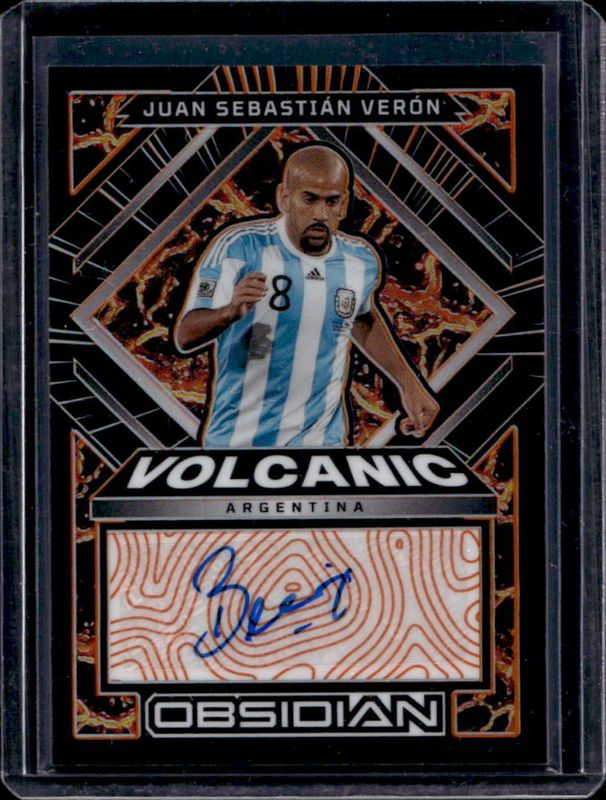 The Juan Sebastian Veron 2022 Obsidian #VS-JSV Volcanic Signatures - Electric Etch Orange /75 card is 1 of 27 Juan Sebastian Veron's card variations in the 2022 Obsidian set being tracked by Sports Card Investor, including Aurora Autographs /199, Volcanic Signatures /199, Lightning Strike Autographs /101, Aurora Autographs - Electric Etch Orange /75, and Lightning Strike Autographs - Electric Etch Orange /75.