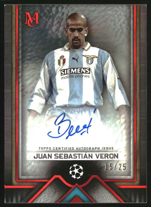 The Juan Sebastian Veron 2023 Topps Museum Collection UEFA Club Competitions #AA-JSV1 Archival Autographs - Ruby /25 card is 1 of 7 Juan Sebastian Veron's card variations in the 2023 Topps Museum Collection UEFA Club Competitions set being tracked by Sports Card Investor, including Archival Autographs /99, Archival Autographs - Amethyst /99, Archival Autographs - Sapphire /75, Archival Autographs - Gold /50, and Archival Autographs - Black Diamond /10.