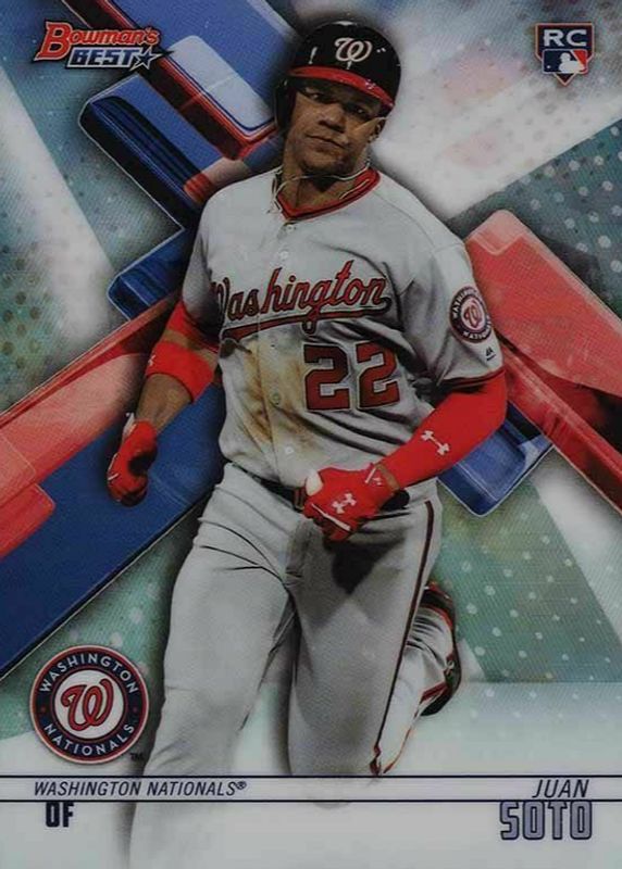 The Juan Soto 2018 Bowman's Best #29 Refractor Rookie card in Raw condition has moved up $4.50 (+33.3%) in the last 30 days and was last sold for $18.00 .