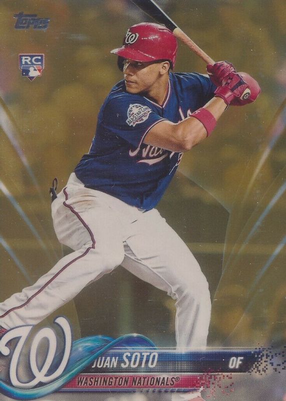The Juan Soto 2018 Topps Update #US300 Gold /2018 Rookie card in Raw condition has moved up $110 (+40.7%) in the last 30 days and was last sold for $380.00 .