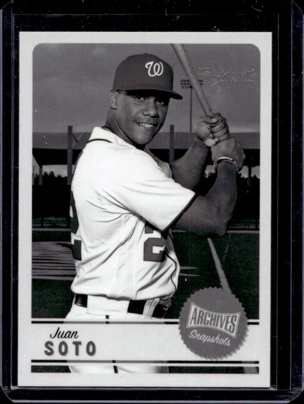 The Juan Soto 2019 Topps Archives Snapshots #AS-JS Black & White card is 1 of 9 Juan Soto's card variations in the 2019 Topps Archives Snapshots set being tracked by Sports Card Investor, including Base, Blue /50, Gold /10, Black /1, and Autographs.