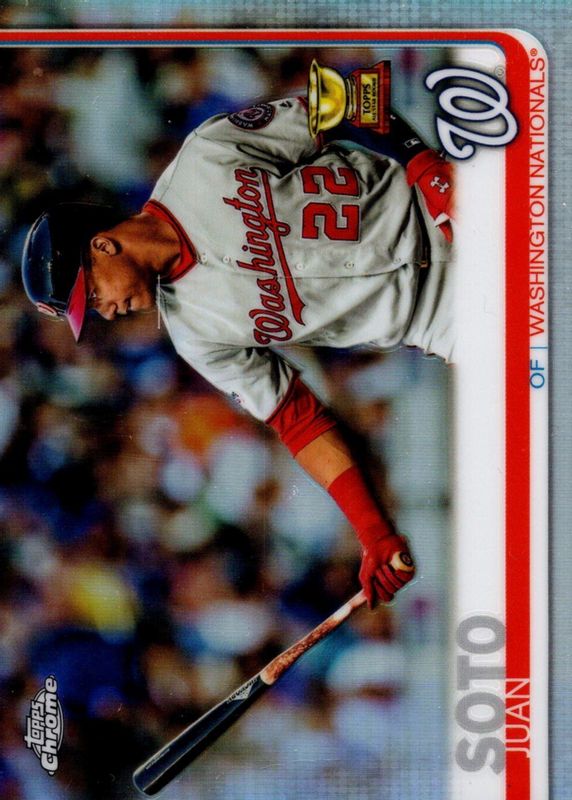 The Juan Soto 2019 Topps Chrome #155 Refractor (Bat in One Hand) card in Raw condition has moved down -$1.00 (-16.7%) in the last 30 days and was last sold for $5.00 .