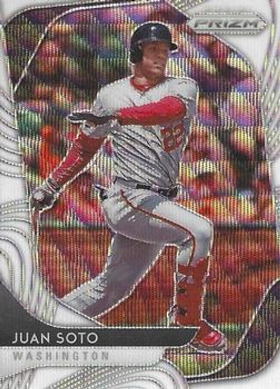 The Juan Soto 2020 Prizm #47 White Wave card is 1 of 124 Juan Soto's card variations in the 2020 Prizm set being tracked by Sports Card Investor, including Base, Blue, Carolina Blue, Cosmic Haze, and Green.