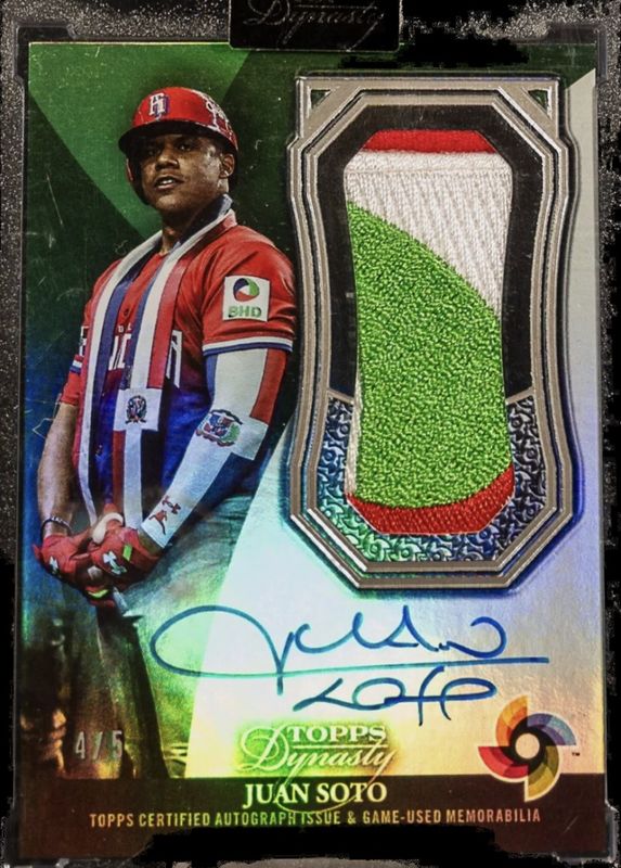 The Juan Soto 2023 Topps Dynasty #DWBC-JS4 World Baseball Classic Autographed Patches - Silver /5 card is 1 of 45 Juan Soto's card variations in the 2023 Topps Dynasty set being tracked by Sports Card Investor, including #ADR-JS Autographed Dual Relics, #AJP-JS Autographed Jumbo Patch, #ASEL-JS3 Autographed Special Event Baseball Leather, #ASEL-JS2 Autographed Special Event Baseball Leather, and #ASEL-JS1 Autographed Special Event Baseball Leather.