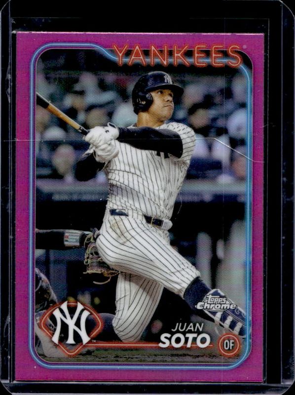 The Juan Soto 2024 Topps Chrome #150 Pink Refractor card is 1 of 60 Juan Soto's card variations in the 2024 Topps Chrome set being tracked by Sports Card Investor, including Base, Prism Refractor, Magenta Speckle Refractor /350, Purple Speckle Refractor /299, and Purple Sonar Refractor /275.