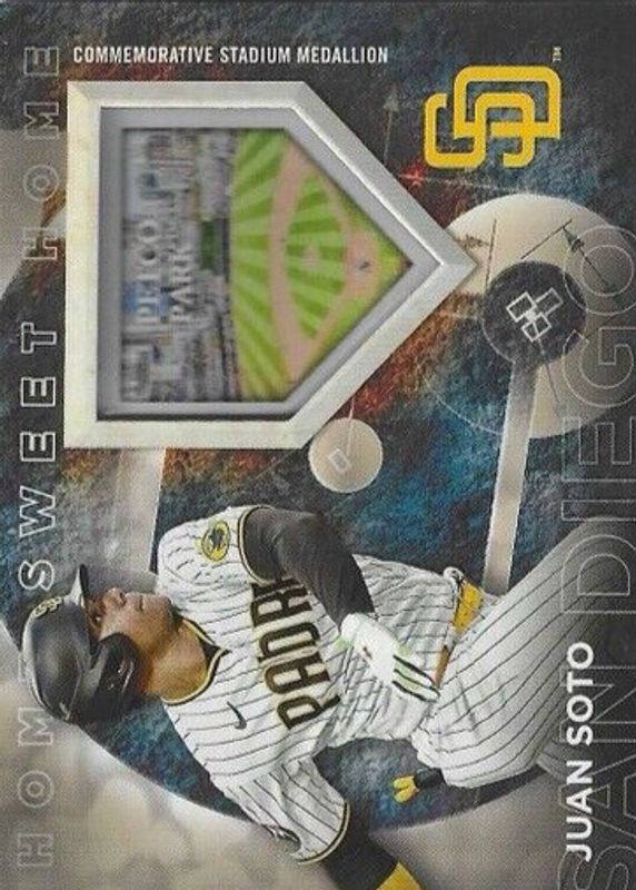 The Juan Soto 2024 Topps #HSH-JS Home Sweet Home Stadium Medallion - Gold /75 card in Raw condition has not changed in price in the last 30 days and was last sold for $23.54 .