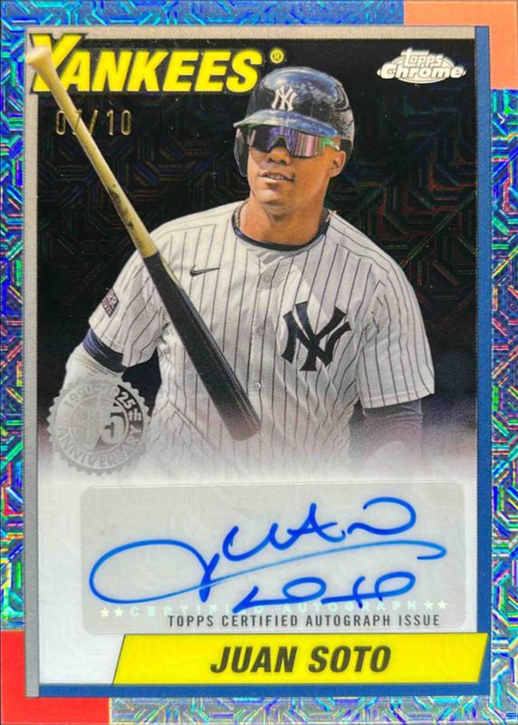 The Juan Soto 2025 Topps #90CA-JSO 1990 Baseball Chrome Silver Pack Autographs (Series 1) - Black Refractor /10 card is 1 of 308 Juan Soto's card variations in the 2025 Topps set being tracked by Sports Card Investor, including Base, Aqua Holo Foil, Diamante Foil, Holo Foil, and Pink Diamante Foil.