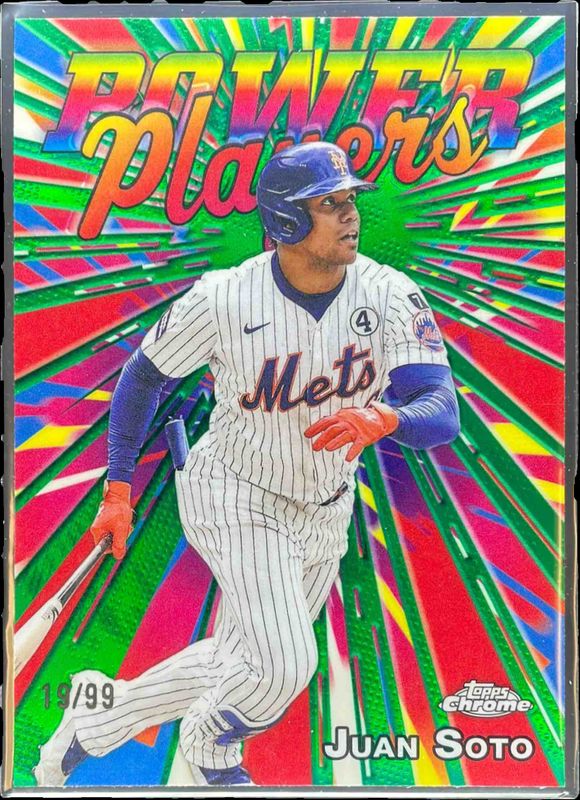 The Juan Soto 2025 Topps Chrome Update #PP-35 Power Players - Green Refractor /99 card is 1 of 70 Juan Soto's card variations in the 2025 Topps Chrome Update set being tracked by Sports Card Investor, including 1990 Topps Chrome, 1990 Topps Chrome - Geometric Refractor, Celebracion - Geometric Refractor, Fortune 15, and Fortune 15 - Geometric Refractor.