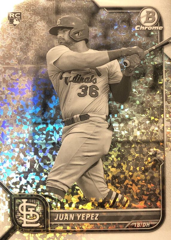 This card is 1 of 22 Juan Yepez's card variations in the 2022 Bowman Chrome set being tracked by Sports Card Investor, including Base, Refractor /499, Fuchsia Refractor /299, Purple Refractor /250, and Aqua RayWave Refractor /199.