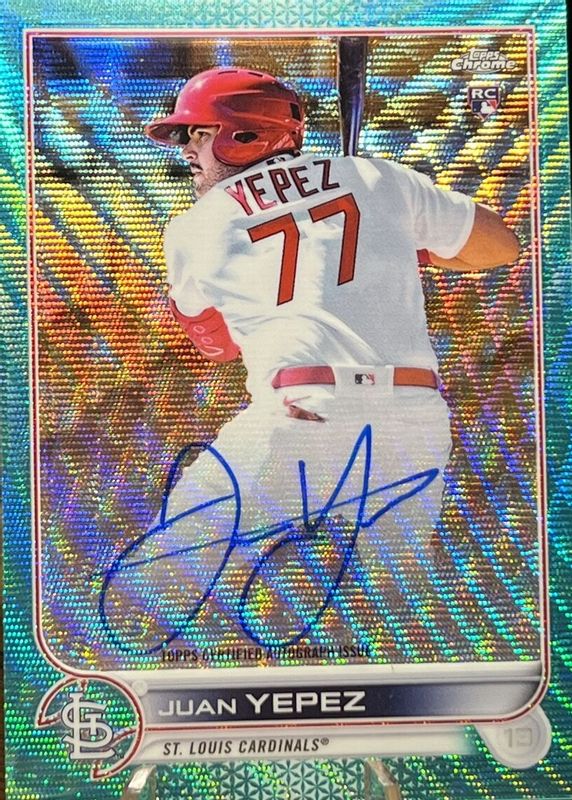 This card is 1 of 15 Juan Yepez's card variations in the 2022 Topps Chrome set being tracked by Sports Card Investor, including Rookie Auto, Rookie Auto - Refractor /499, Rookie Auto - Purple Speckle Refractor /299, Rookie Auto - Purple Refractor /250, and Rookie Auto - Blue RayWave Refractor /150.