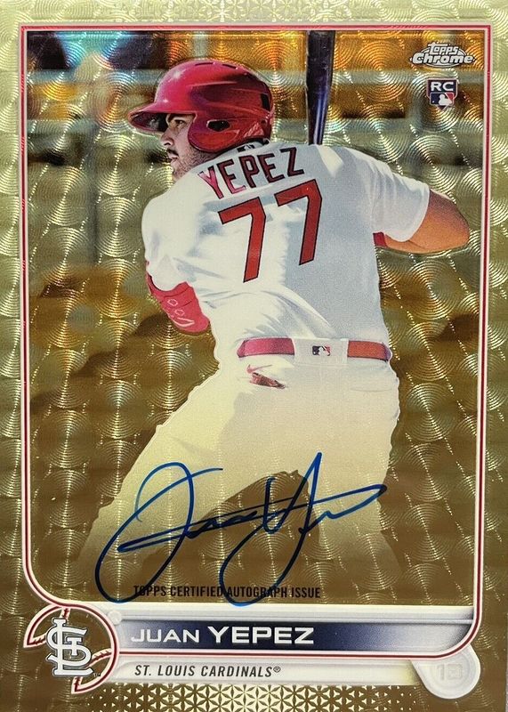 This card is 1 of 15 Juan Yepez's card variations in the 2022 Topps Chrome set being tracked by Sports Card Investor, including Rookie Auto, Rookie Auto - Refractor /499, Rookie Auto - Purple Speckle Refractor /299, Rookie Auto - Purple Refractor /250, and Rookie Auto - Aqua Wave Refractor /199.