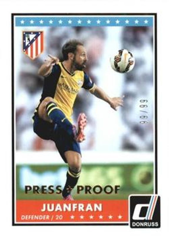 The Juanfran 2015 Donruss #31 Gold Press Proof /99 card is 1 of 8 Juanfran's card variations in the 2015 Donruss set being tracked by Sports Card Investor, including Base, Bronze Press Proof /299, Silver Press Proof /199, Red Soccer Ball /49, and Green Soccer Ball /25.