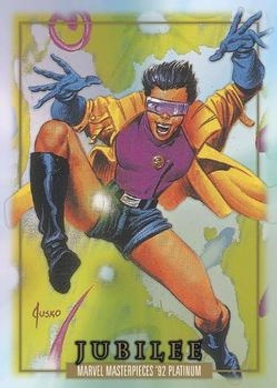 The Jubilee 2024 Upper Deck Marvel Masterpieces '92 Platinum #100 Base card is 1 of 38 Jubilee's card variations in the 2024 Upper Deck Marvel Masterpieces '92 Platinum set being tracked by Sports Card Investor, including Blue Traxx, Canvas, Clear Cut, Emerald Surge, and Holofoil.