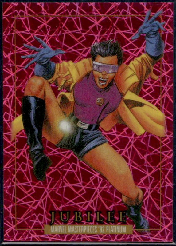 The Jubilee 2024 Upper Deck Marvel Masterpieces '92 Platinum #100 Pink Laser /992 card is 1 of 38 Jubilee's card variations in the 2024 Upper Deck Marvel Masterpieces '92 Platinum set being tracked by Sports Card Investor, including Base, Blue Traxx, Canvas, Clear Cut, and Emerald Surge.