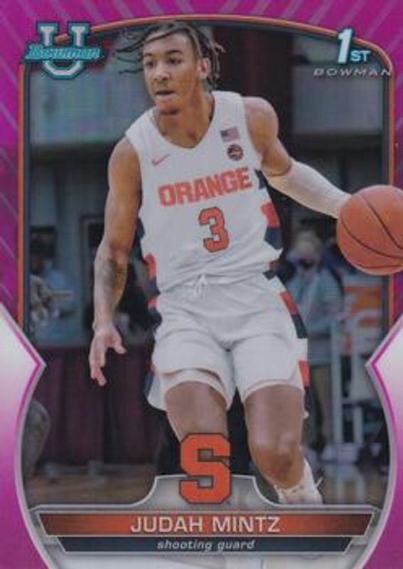 The Judah Mintz 2022 Bowman Chrome University #33 Pink Refractor card is 1 of 51 Judah Mintz's card variations in the 2022 Bowman Chrome University set being tracked by Sports Card Investor, including Base, Purple Shimmer Refractor, Shimmer Refractor, Purple Mini-Diamond Refractor /399, and Purple Refractor /399.
