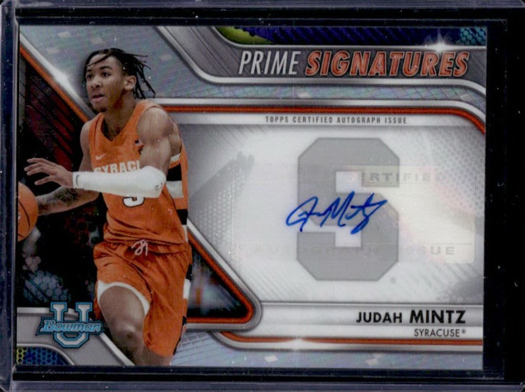 The Judah Mintz 2022 Bowman Chrome University #PCS-JM Prime Chrome Signatures /50 card is 1 of 51 Judah Mintz's card variations in the 2022 Bowman Chrome University set being tracked by Sports Card Investor, including Base, Pink Refractor, Purple Shimmer Refractor, Shimmer Refractor, and Purple Mini-Diamond Refractor /399.