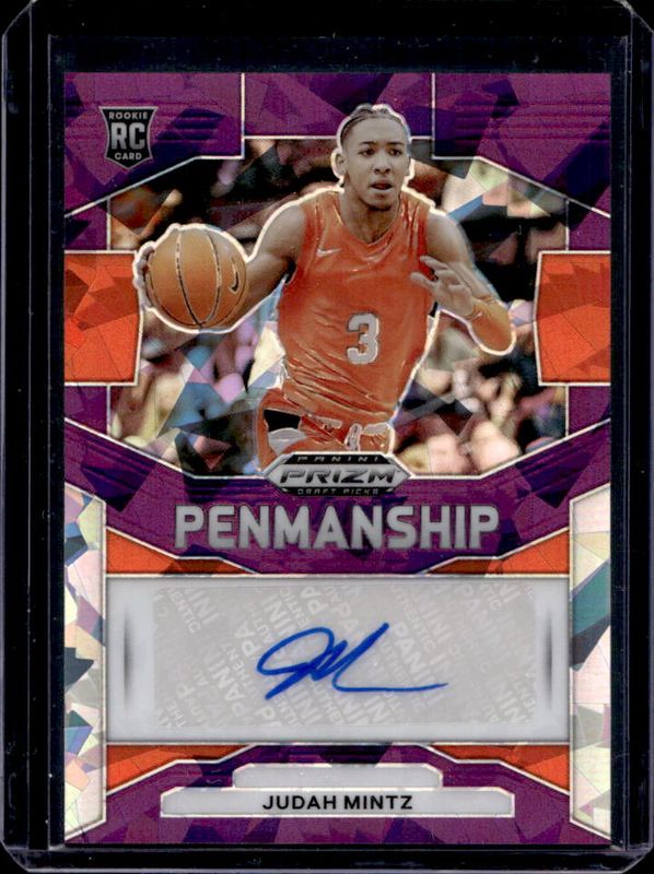 The Judah Mintz 2024 Prizm Draft Picks #P-JMZ Penmanship - Purple Ice /99 card is 1 of 28 Judah Mintz's card variations in the 2024 Prizm Draft Picks set being tracked by Sports Card Investor, including Draft Picks Autographs, Draft Picks Autographs - Hyper, Draft Picks Autographs - Silver, Penmanship, and Penmanship - Hyper.