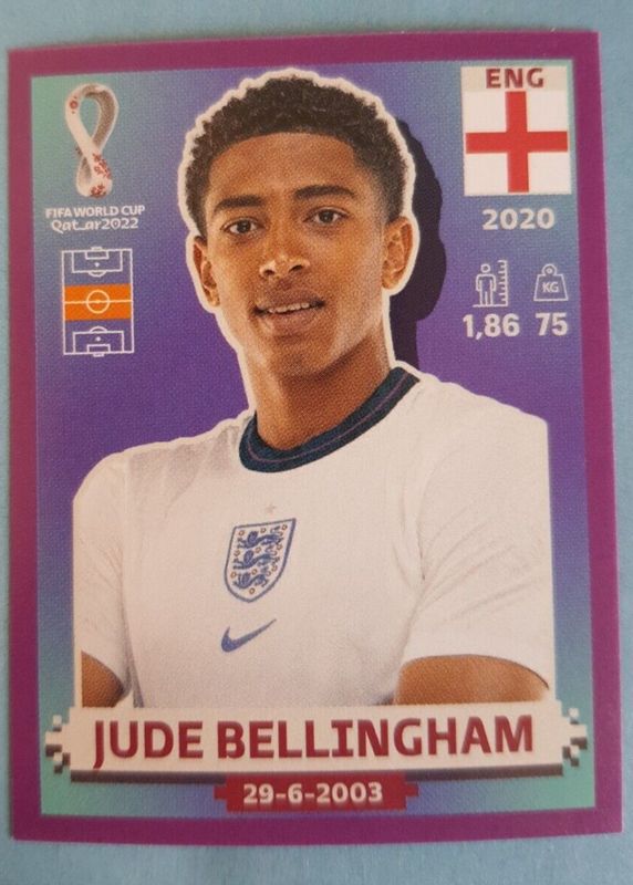 The Jude Bellingham 2022 Panini World Cup Stickers #ENG11 Purple (1:205) card in Raw condition has not changed in price in the last 30 days and was last sold for $102.57 .