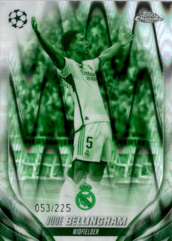 The Jude Bellingham 2023 Topps Chrome UEFA Club Competitions #112 Night Vision RayWave Refractor /225 card in Raw condition has not changed in price in the last 30 days and was last sold for $18.87 .