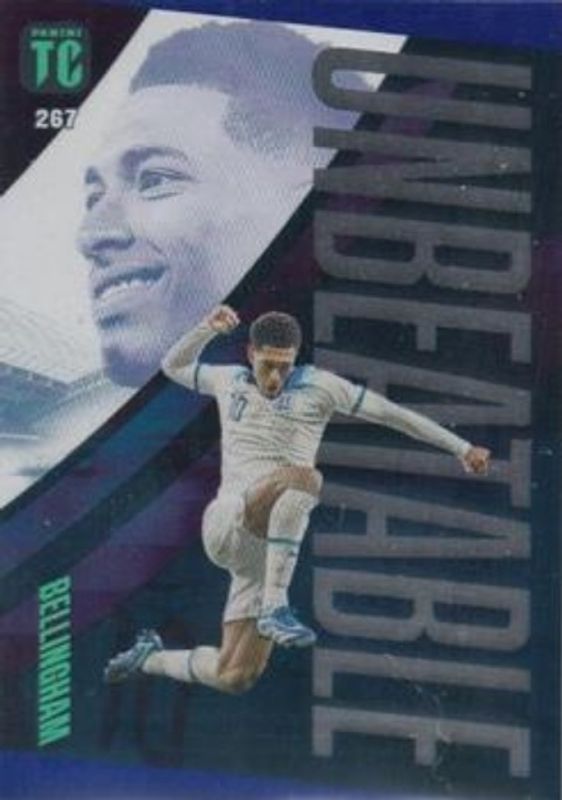 The Jude Bellingham 2024 Panini Top Class #267 Unbeatable True Blue card is 1 of 9 Jude Bellingham's card variations in the 2024 Panini Top Class set being tracked by Sports Card Investor, including #205 Base, #267 Base, #69 Base, #267 Unbeatable Bright Gold, and #267 Unbeatable Green Light.