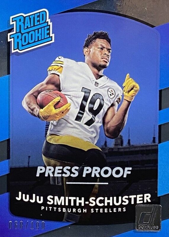 This card is 1 of 14 JuJu Smith-Schuster's card variations in the 2017 Donruss set being tracked by Sports Card Investor, including Base, Aqueous Test, Jersey Number (/19), Press Proof Blue, and Press Proof Bronze.