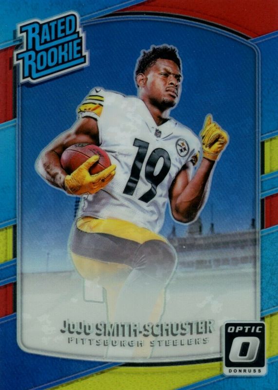 The JuJu Smith-Schuster 2017 Optic #176 Red & Yellow Rookie card in Raw condition has moved down -$0.25 (-20.0%) in the last 30 days and was last sold for $1.00 .