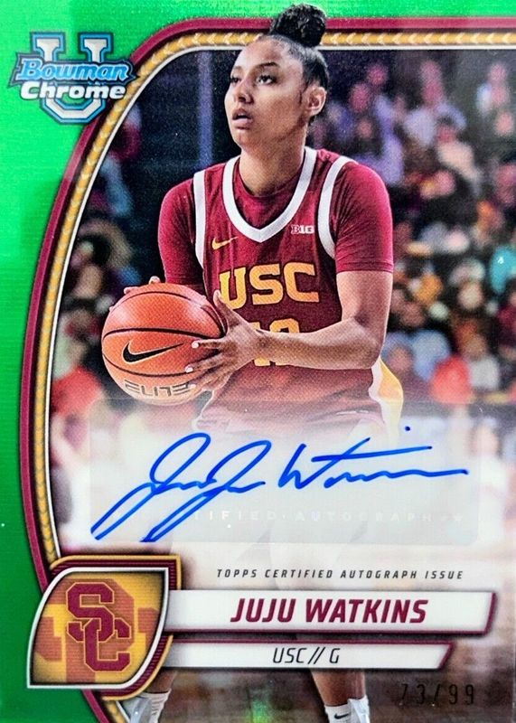 The JuJu Watkins 2024 Bowman Chrome University #37 Prospect Auto - Green Refractor /99 card in Raw condition has not changed in price in the last 30 days and was last sold for $320.00 .