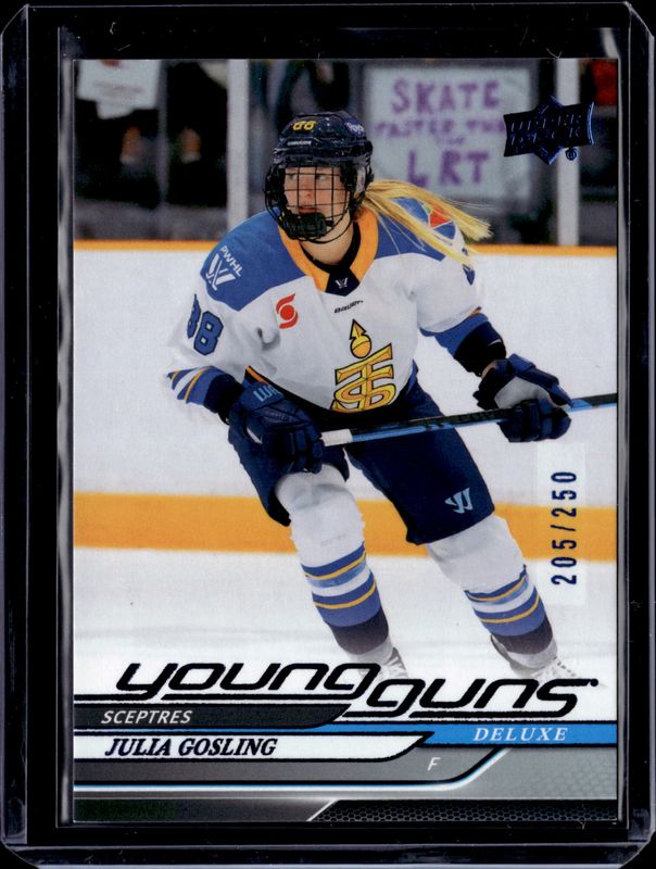 The Julia Gosling 2025 Upper Deck PWHL #63 Young Guns - Deluxe /250 card is 1 of 8 Julia Gosling's card variations in the 2025 Upper Deck PWHL set being tracked by Sports Card Investor, including PWHL Autographs, Young Guns, Young Guns - Outburst, Young Guns - Exclusives /100, and Young Guns - Outburst Red /25.