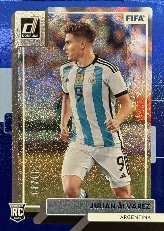 The Julian Alvarez 2022 Donruss #8 Blue /49 (National) Rookie card in Raw condition has not changed in price in the last 30 days and was last sold for $25.21 .