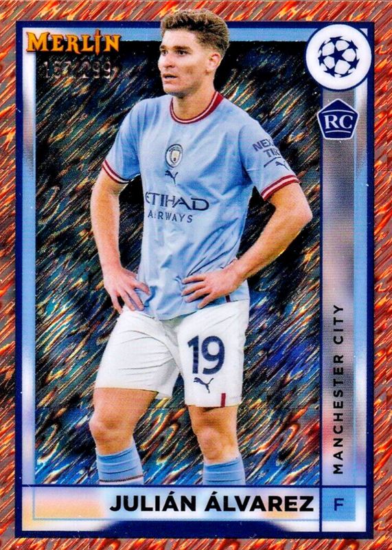 The Julian Alvarez 2022 Topps Merlin Chrome UEFA Club Competitions #94 Rose Gold Shimmer Refractor /299 Rookie card in Raw condition has not changed in price in the last 30 days and was last sold for $18.69 .
