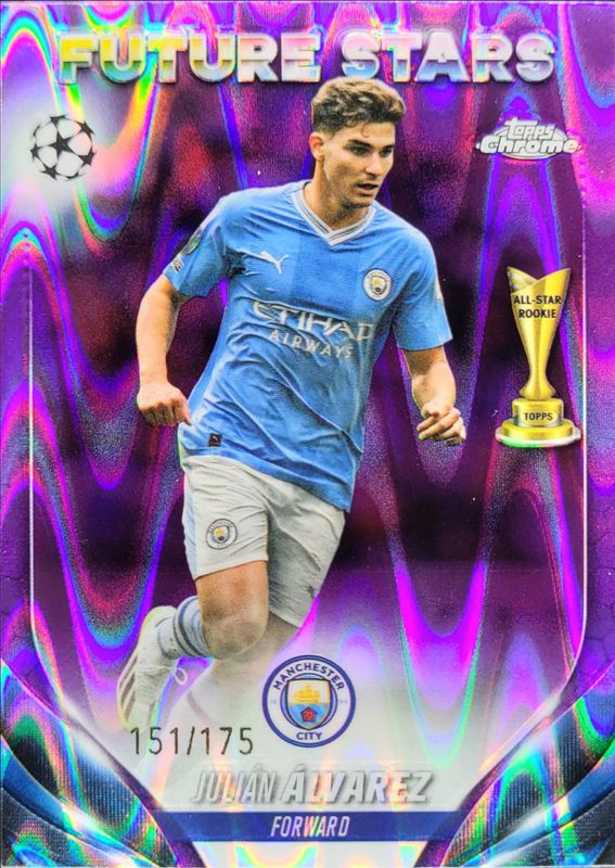 The Julian Alvarez 2023 Topps Chrome UEFA Club Competitions #150 Purple RayWave Refractor /175 card is 1 of 68 Julian Alvarez's card variations in the 2023 Topps Chrome UEFA Club Competitions set being tracked by Sports Card Investor, including Base, Aqua Lava Refractor, Aqua Prism Refractor, Blue Lava Refractor, and Gold Lava Refractor.