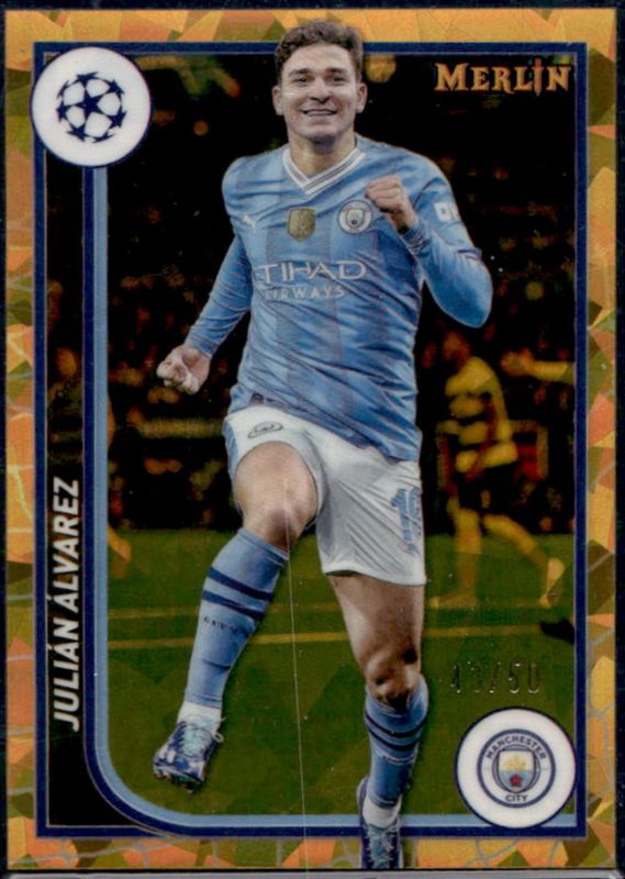 The Julian Alvarez 2023 Topps Merlin Chrome UEFA Club Competitions #76 Gold Atomic Refractor /50 card is 1 of 45 Julian Alvarez's card variations in the 2023 Topps Merlin Chrome UEFA Club Competitions set being tracked by Sports Card Investor, including Base, Aqua Prism Refractor, Refractor, Vintage Merlin Refractor, and Neon Green Shimmer Refractor /399.