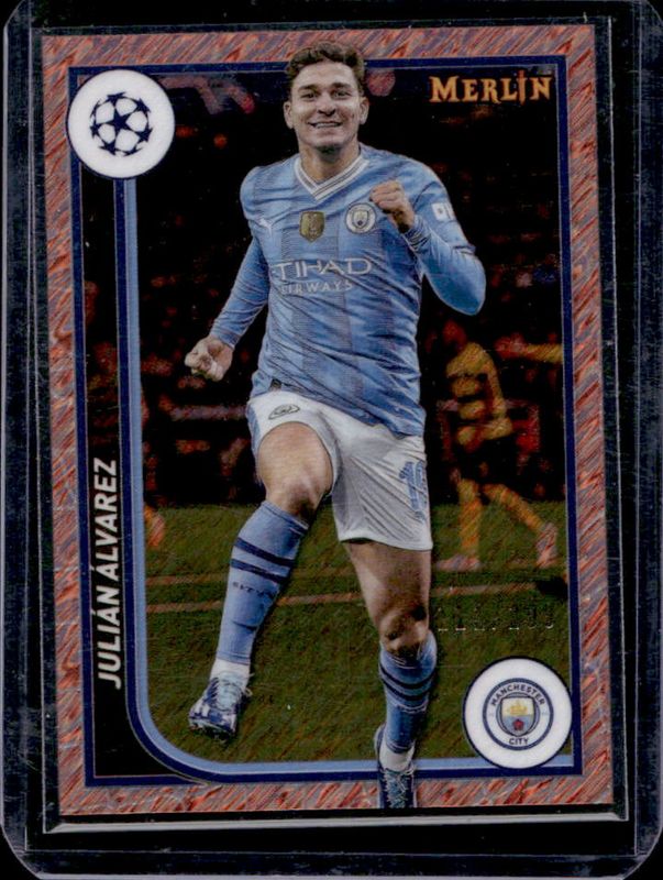 The Julian Alvarez 2023 Topps Merlin Chrome UEFA Club Competitions #76 Rose Gold Shimmer Refractor /299 card is 1 of 45 Julian Alvarez's card variations in the 2023 Topps Merlin Chrome UEFA Club Competitions set being tracked by Sports Card Investor, including Base, Aqua Prism Refractor, Refractor, Vintage Merlin Refractor, and Neon Green Shimmer Refractor /399.