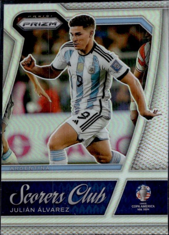 The Julian Alvarez 2024 Prizm Copa America #13 Scorers Club - Silver card is 1 of 47 Julian Alvarez's card variations in the 2024 Prizm Copa America set being tracked by Sports Card Investor, including Base, Green Ice, Green Wave, Hyper, and Ice.