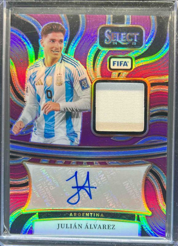 The Julian Alvarez 2024 Select FIFA #AM-JA Autographed Memorabilia Purple /49 card is 1 of 106 Julian Alvarez's card variations in the 2024 Select FIFA set being tracked by Sports Card Investor, including Autographed Memorabilia, Autographed Memorabilia Blue Pulsar, Autographed Memorabilia Peacock, Autographed Memorabilia Red, and Field Level.