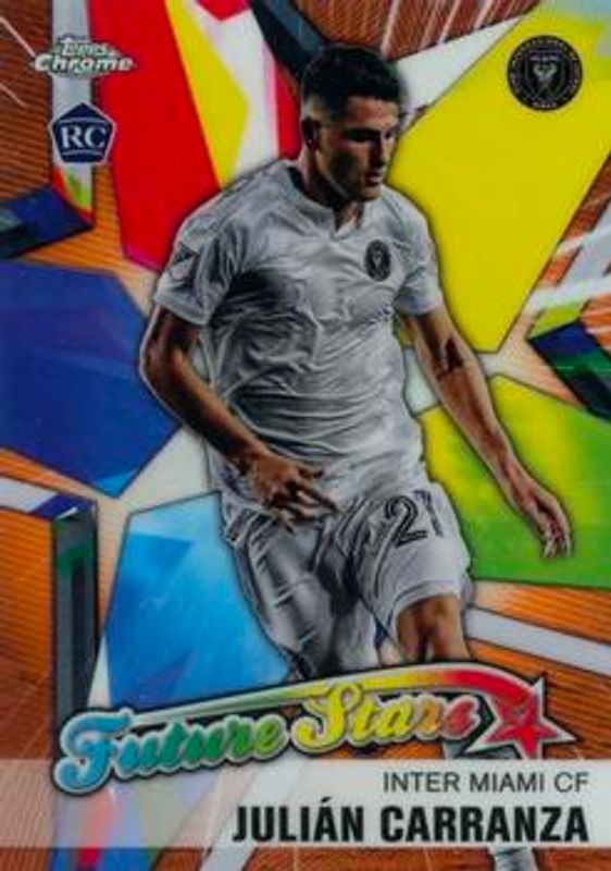The Julian Carranza 2021 Topps Chrome MLS #FS-19 Future Stars - Orange Refractor /25 Rookie card is 1 of 26 Julian Carranza's card variations in the 2021 Topps Chrome MLS set being tracked by Sports Card Investor, including #155 Base, #155b Base, #CFC-16 Celebration FC, #FS-19 Future Stars, and #155 Pink X-Fractor.