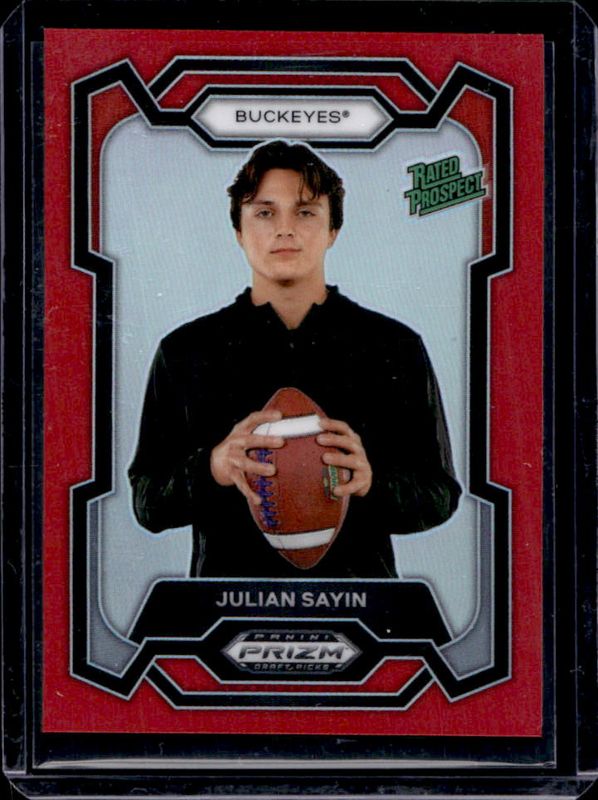 The Julian Sayin 2024 Prizm Draft Picks #193 Red /299 card is 1 of 70 Julian Sayin's card variations in the 2024 Prizm Draft Picks set being tracked by Sports Card Investor, including Base, Green, Purple Wave, Red Ice, and Ruby Wave.