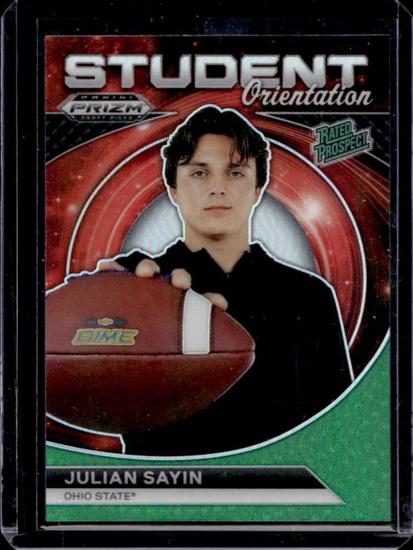 The Julian Sayin 2024 Prizm Draft Picks #SO-JS Student Orientation - Green card is 1 of 70 Julian Sayin's card variations in the 2024 Prizm Draft Picks set being tracked by Sports Card Investor, including Base, Green, Purple Wave, Red Ice, and Ruby Wave.