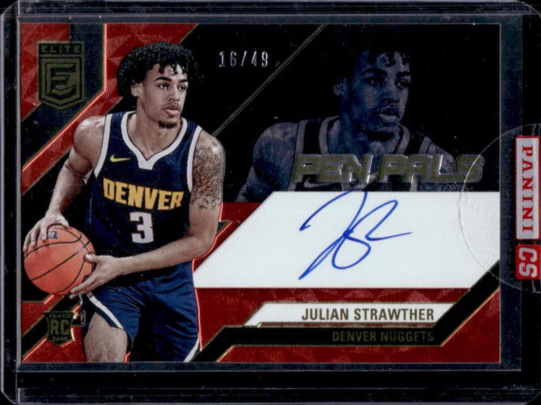 The Julian Strawther 2023 Elite #16 Pen Pals - Red /49 Rookie card is 1 of 40 Julian Strawther's card variations in the 2023 Elite set being tracked by Sports Card Investor, including Base, Aspirations, International, Orange, and Blue /99.