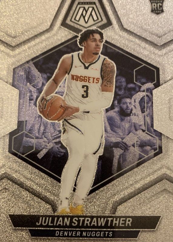 The Julian Strawther 2023 Mosaic #214 Glitter /(SSP) Rookie card in Raw condition has not changed in price in the last 30 days and was last sold for $23.25 .