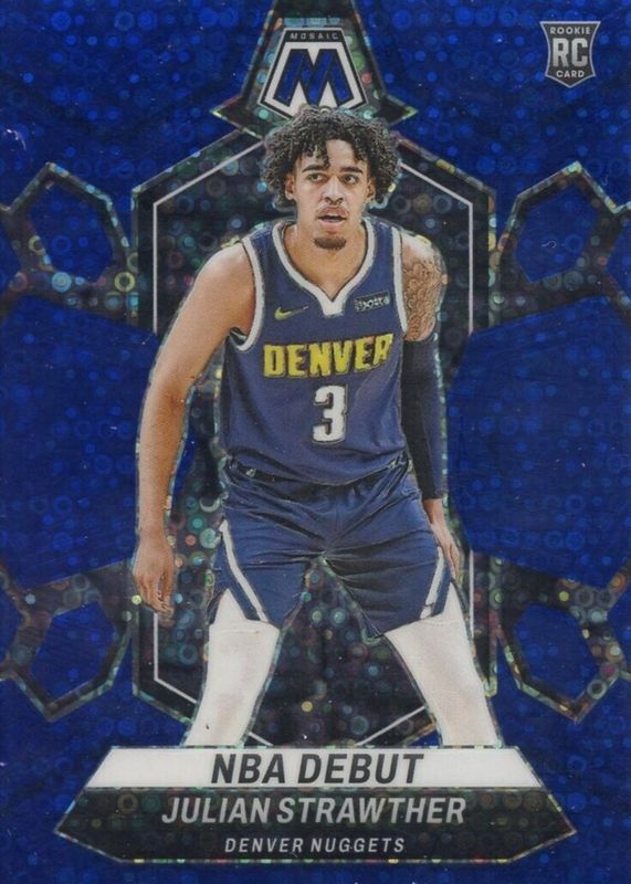 The Julian Strawther 2023 Mosaic #256 NBA Debut - Fast Break Blue /85 Rookie card in Raw condition has not changed in price in the last 30 days and was last sold for $1.00 .