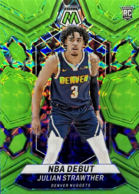 The Julian Strawther 2023 Mosaic #256 NBA Debut - Green Fluorescent /10 Rookie card in Raw condition has not changed in price in the last 30 days and was last sold for $21.00 .