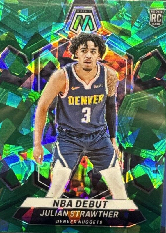 The Julian Strawther 2023 Mosaic #256 NBA Debut - Green Ice Rookie card in Raw condition has not changed in price in the last 30 days and was last sold for $2.75 .
